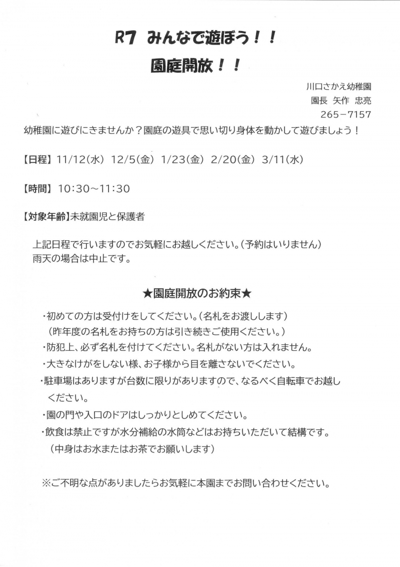 注意事項をよくお読みになり、お友だちをお誘いの上、ぜひさかえ幼稚園に遊びに来てください♪ご予約はいりません。