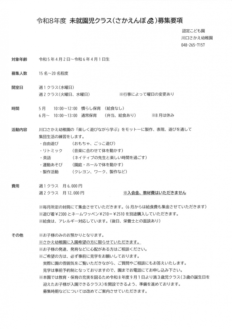 令和8年度の未就園児教室『さかえんぼ』の募集を開始いたします。