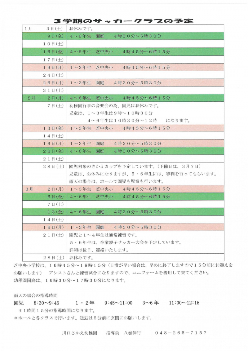 R7年度 3学期サッカークラブの予定